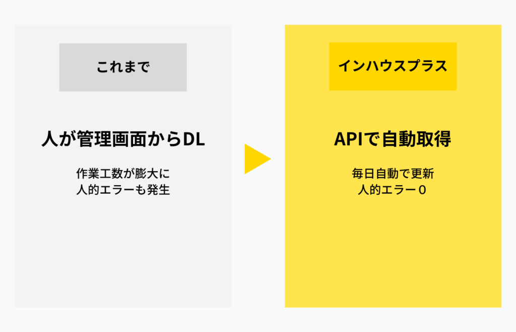 各管理画面にログインしてCSVダウンロードするといった生産性の低い作業から解放されます。またコピペの作業ミスなど人的エラーも無くなります。