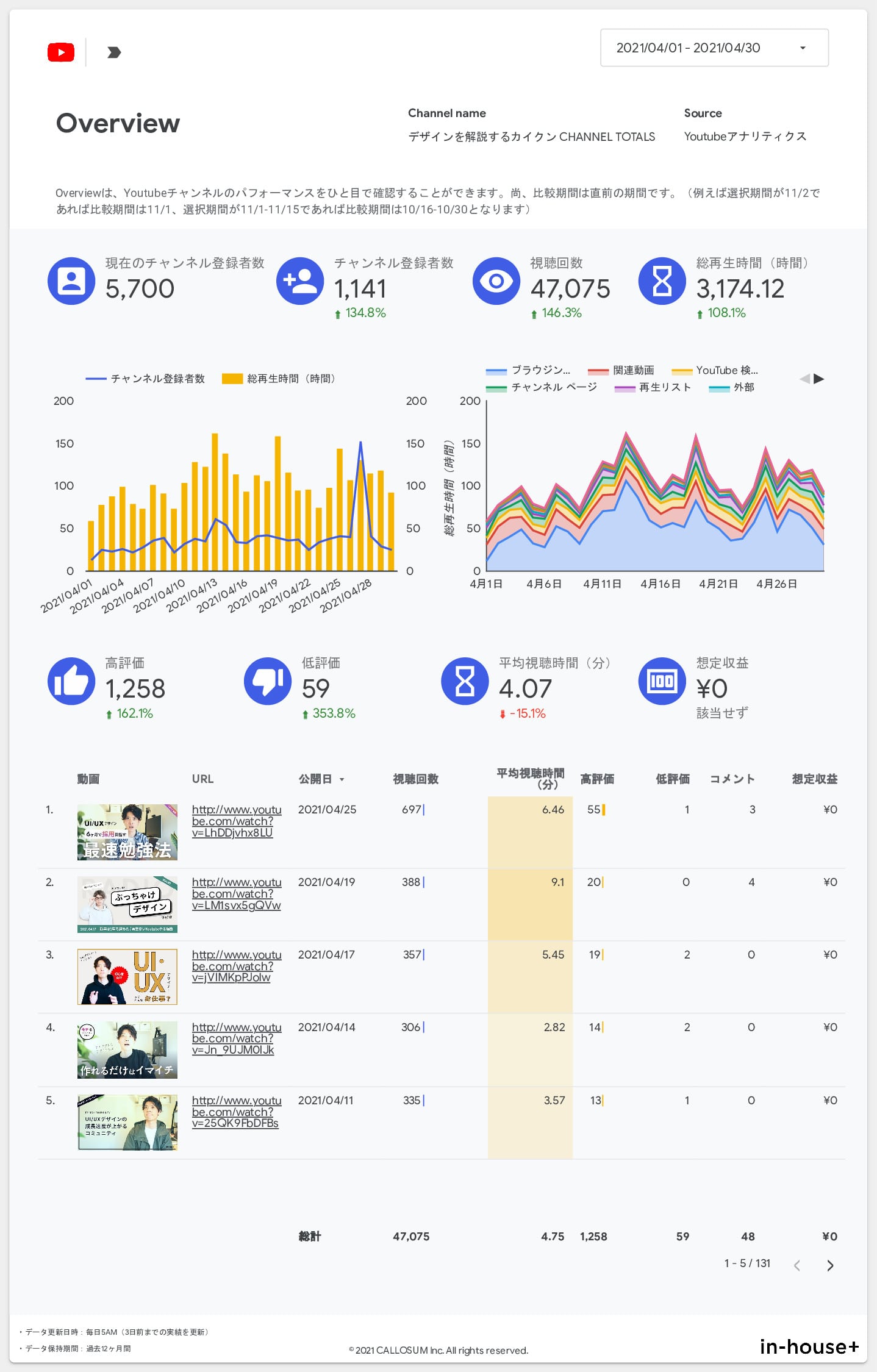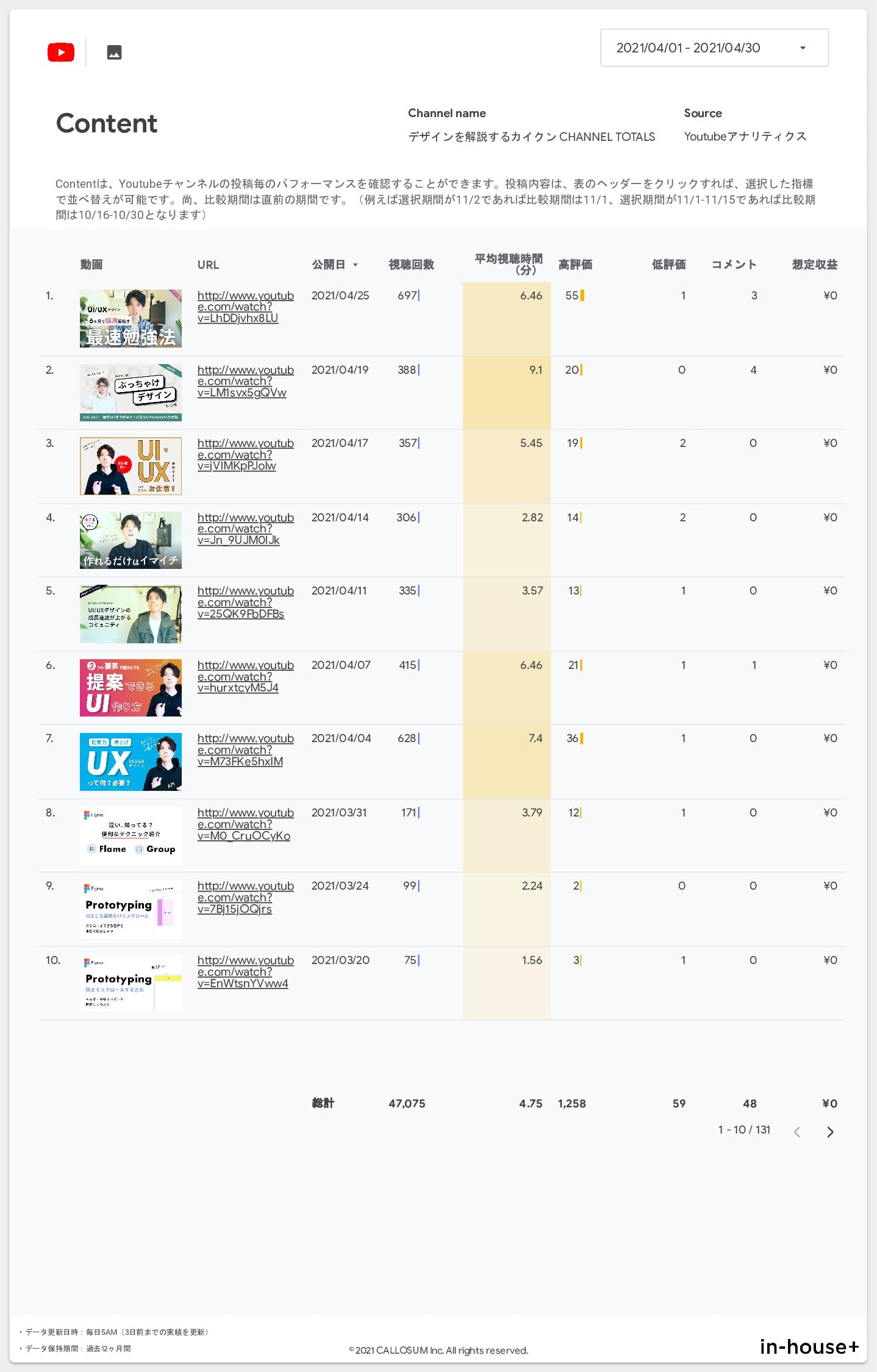 現在、140項目データに対応しており、Youtubeアナリティクスで使えるほぼすべての項目が利用可能です。詳しくは無料トライアルの実際のレポートでご確認ください。